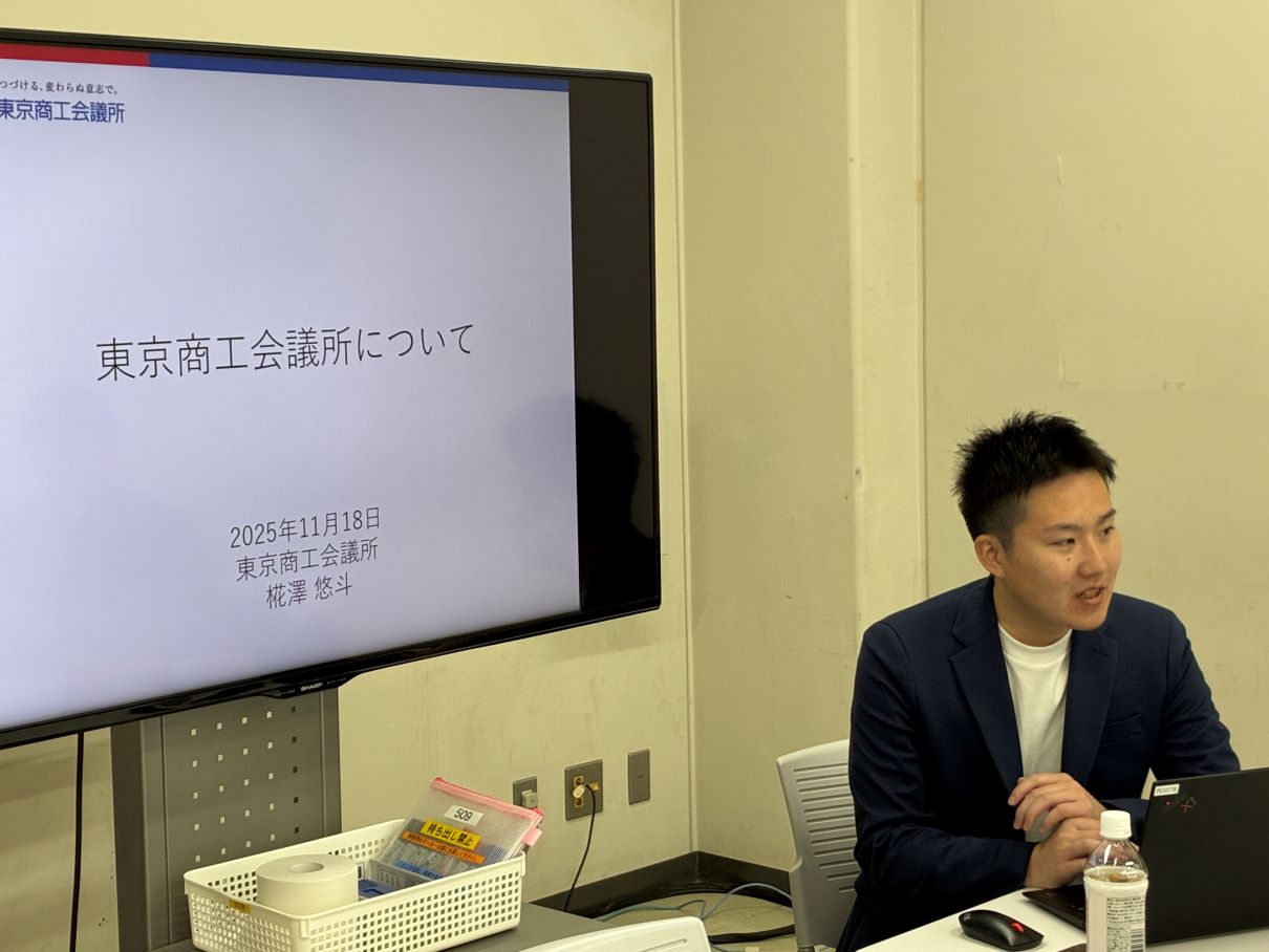 東京商工会議所の椛澤悠斗さんをゲスト講師にお迎えしました(11月18日)東京商工会議所・中小企業部の椛澤悠斗(かばさわ・ゆうと)さんにお話しいただきました。椛澤さんは小関ゼミの卒業生で、大学卒業後に製造業の企業に就職し、コロナ禍を経て2022年に東京商工会議所に転職しました。 中小企業経営者の相談を受ける仕事を経て、現在は中小企業に関する政策要望・提言を出す仕事に携わっているとのこと。 在学中から、中小企業支援には関心があったそうです。 椛澤さんには、東京商工会議所の組織・事業についてご説明いただいた後、学生からの質問に答えていただきました。 先輩からの貴重なお話と、後輩への心温まるメッセージ、ありがとうございました。 講義の後、企業経営者から相談されたらどう応えればいいのか、学生と意見交換しました。中小企業の経営を支援するというのは、 実際にはけっこう大変そうだな〜と感じました。 椛澤さんは、産学連携ということで、いまでもずっと、明治大学(⇒東京商工会議所の会員)とのつながりを保ってくれています。嬉しいですね。今後ますますの活躍を祈ります。 大阪大学の岩瀧敏昭先生、薬樹株式会社の伊藤直子さんをゲスト講師にお迎えしました(10月28日)大阪大学国際公共政策研究科の特任准教授、岩瀧敏昭先生と、薬樹株式会社執行役員の伊藤直子さんにお話しいただきました。岩瀧先生は地域活性化をライフワークとし、長年にわたって様々な地域で研究と実践にかかわってこられました。岩瀧先生には、 再生可能エネルギーに関連して、「地域の人に寄り添うのか、企業に寄り添うのか、環境保護なのか」というジレンマを提起していただきました。 他にも、京町家の事例から、景観保全に住民が関心をもって関わることの重要性や、「金儲けになる文化・ならない文化」という区分け、 さらには地震などの自然災害に関して避難所の改善の必要性など、多岐にわたる問題提起をしていただきました。 一言で地域活性化といっても様々な側面があり、また簡単に解決策が見いだせるものでもないことを感じました。 伊藤直子さんは、全国に多数の薬局を展開する企業の経営者ですが、この薬樹株式会社は単に薬を売るだけの普通の薬局ではないといいます。 それどころか、薬を減らそうとしているという、とても珍しい薬局なのだそうです。 高齢者が大量の薬を飲むことが本当に幸せなことなのかと問いかけ、地域コミュニティの中で豊かな人間関係を築くこと、自然環境を 整えていくことを重視した経営方針を掲げ、まさにSDGsの先駆けとして注目されてきました。 伊藤さんは本業のほかにも、マスター消費者アドバイザーや、大学の研究員の顔も持っていて、「二足のわらじ」ならぬ「四足のわらじ」 で、多方面で活躍されています。視野を広げ、価値観を豊かにするためにも、所属先を複数持つことが大事だと思いました。 とても興味深い講演、ありがとうございました。