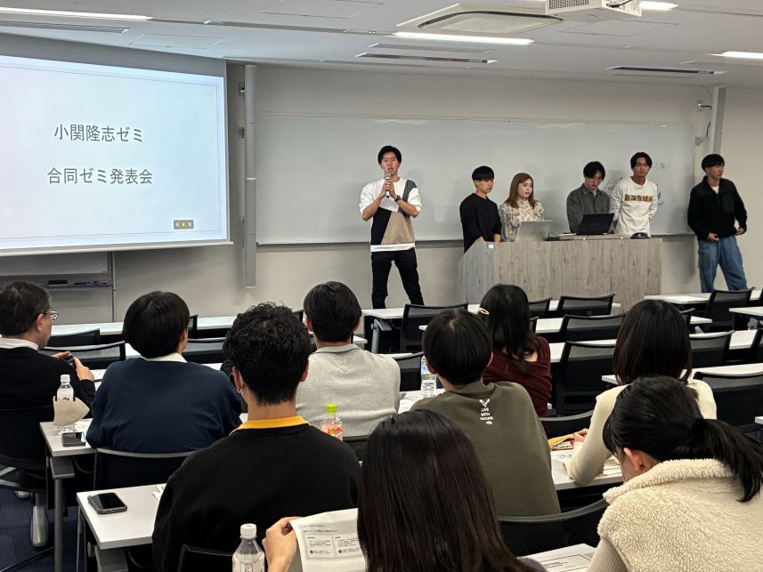3年生の合同発表会を開きました(12月16日)立教大学藤井ゼミ・原田ゼミ、明治大学大高ゼミ・小関ゼミの4ゼミ合同発表会を、明治大学駿河台キャンパスで開きました。働き方の問題、地域活性化、若者・女性の生きづらさの問題など、研究テーマは様々でしたが、それぞれ学生さんが真摯にテーマに向き合い、 調査や議論を重ねて、この日の発表に臨んだということがよく伝わってきました。 小関ゼミ3年生は4班に分かれ、それぞれのテーマについて短時間で発表しました。これまでに調べた内容はたくさんありましたが、 発表できたことは時間の都合上、そのエッセンスだけでした。それでも、重要な点はしっかり伝わっていたと思います。 ・ミッフィー:若者・女性の生きづらさの問題とその対策 ・日本の特食なるほどザワールド:日本の食文化を海外に発信・展開 ・チーム蹴球:サッカーなどの球技を若者・ファミリー層に普及 ・DMO:デスティネーション・キャンペーンによる観光客の誘致 いつもは自分たちのことしかわかりませんが、合同発表会を通して、他のゼミの人たちが何を研究しているのかを広く知る機会も大事だなと思っています。 発表会の後に続けて懇親会を持ち、クイズ大会を楽しみました。準備・進行をしてくれた大高ゼミの皆さんに感謝です。ありがとう!