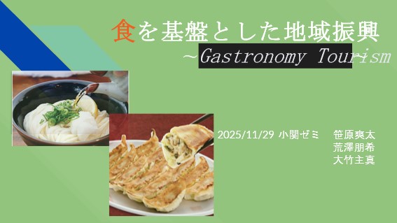 2025年度の活動合同発表会を行いました(11月29日)例年、3年生が他のゼミといっしょに合同発表会を開いています。立教大学コミュニティ福祉学部の藤井敦史ゼミと原田晃樹ゼミ、明治大学政治経済学部の大高研道ゼミと、経営学部小関ゼミの 4つのゼミで、土曜日の午後に発表会を開き、各ゼミが8か月間調査研究してきた内容をまとめて発表しました。 各ゼミ30分間と発表時間が限られていたので、調べた内容のごく一部しか紹介できませんでしたが、いずれも濃い内容でした。 今年度の3年生は、地域活性化という大きなテーマでは共通しているものの、音楽、スポーツ、食とそれぞれ異なる分野から 地域活性化に迫り、バリエーションの豊富な内容でした。 藤井ゼミは愛媛県の無茶々園について、大高ゼミは ワーカーズコープちばについて、原田ゼミは地域食堂・こども食堂等について、 それぞれ調査結果を発表しました。広い意味では各ゼミが地域活性化という点で関連がありますが、関心やアプローチに違いが あり、互いに良い刺激になりました。 発表終了後は、原田ゼミの企画でレクリエーションを楽しみました。クイズ大会と、ジェスチャーゲームで大いに盛り上がり、楽しい ひと時を過ごしました。皆さん、参加していただきありがとうございました。 各グループ(食、音楽、スポーツ)のスライドは以下からダウンロードできます。
