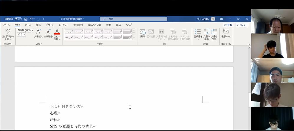 オリエンテーション(5月12日)3年生はGW明けからようやく、ZOOMでのゼミ活動が始まり、5月12日にオリエンテーションとして、ゼミ長・副ゼミ長などの担当決め、 次週以降の活動についての説明、グループ単位のディスカッションなどを行いました。顔合わせと懇親会(4月)新型コロナウィルス感染症の拡大により、4月10日に始まるはずだった春学期の授業は開始をしばらく見合わせることになり、 結果的に1か月延期したうえ、オンラインでの授業開始となりました。とはいえ、1か月間何もしないのは学生にとっても不安が募りますし、時間の浪費を避けたいということもあって、3年生に関しては、4月23日と29日 の2回に分けて、ZOOMで初顔合わせを行いました。 この顔合わせでは、自己紹介、ゼミ入室試験について(お知らせ)、オンライン授業についての説明、ゼミ活動の進め方(提案と希望)、 興味関心のあるテーマについて話し合いました。 また4月28日には、ZOOMで懇親会(宅飲み)を試みました。各自が自宅でくつろいでいる様子が垣間見えましたが、いつもの懇親会とは違って 一体感に欠ける感じは否めませんでした。 4年生は、4月24・25日にオンラインでオリエンテーションを開き、今後のスケジュールを確認しました。 2019年度の活動4年生が卒業論文を提出しました(1月29日)4年生が1年間の研究の成果を卒業論文としてまとめました。非常に幅広いテーマにわたっています。 こちらからご覧ください。 3年生の報告書ができ上がりました(1月23日)先月の合同報告会のプレゼンテーションをもとにレポートを作成しました。これまでの約1年間の活動を振り返った写真も掲載しています。