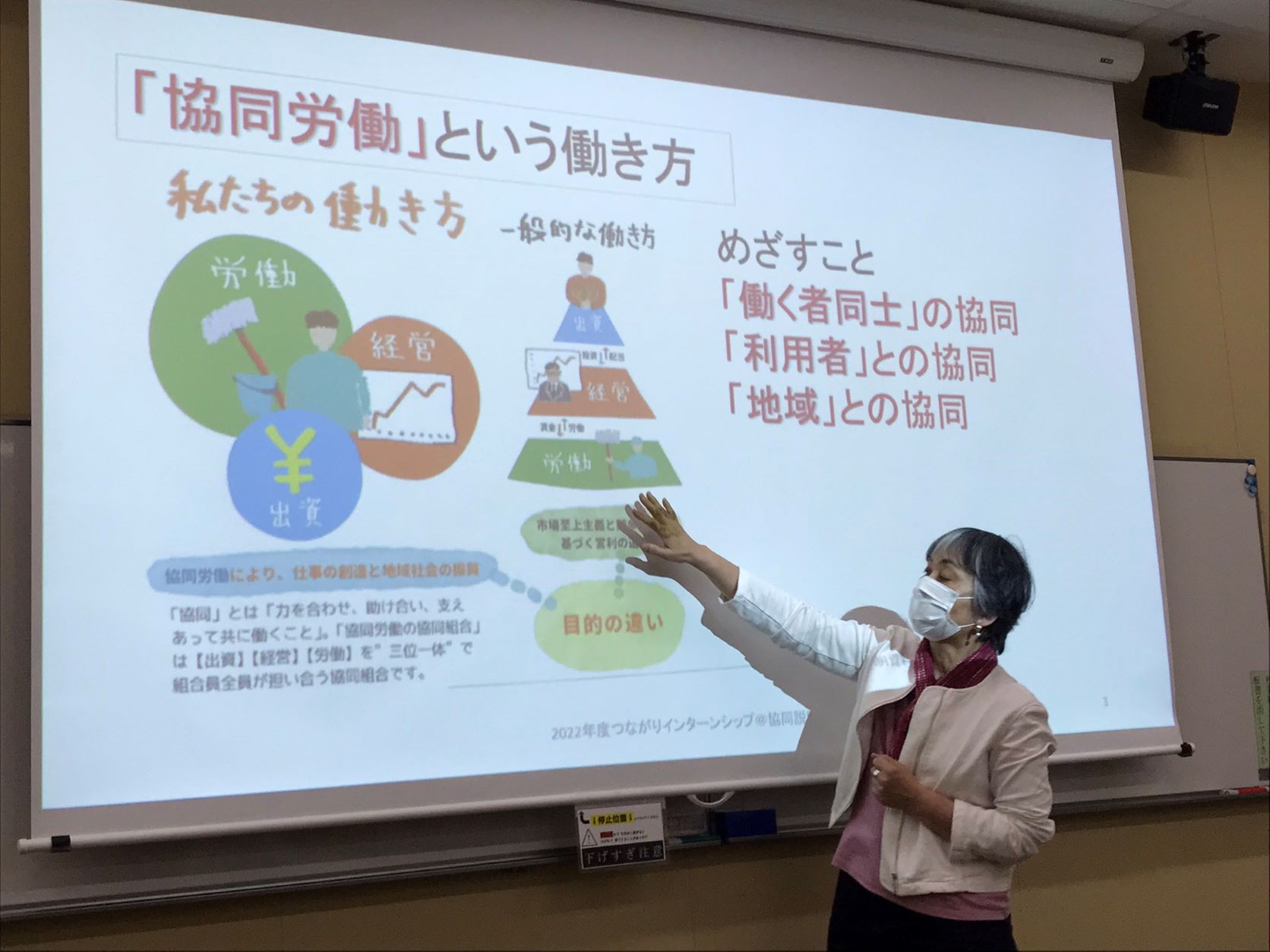 日本労協連・志波早苗さんにゲストとしてお越しいただきました(11月14日)日本労働者協同組合連合会センター事業団 東京中央事業本部相談役の志波早苗さんに、 ゲスト講師としてお越しいただきました。学生からの質問にお答えいただくかたちで、協同組合とりわけ労働者協同組合で働くことについて、また志波さんの前職である 「くらしサポート・ウィズ」の生活相談事業について、幅広くお話しいただきました。 一般の企業とは違う、またNPOとも違う、「協同組合」の存在は私たちの生活にごく身近な存在でありながら、あまり意識することがなく 協同組合の特徴や、協同組合と社会課題とのかかわりについては、意外と知られていません。 志波さんは10年前から協同組合や社会的企業でのインターンシップ事業 を手がけ、今では明治大学や立教大学など多くの大学が参加する 規模に成長してきました。インターンシップを通して、学生の皆さんには協同組合で働くことの意義(人と人のつながり)を実感して ほしい、そして働く意味をそこに見出してほしいと願っています。 もちろん、協同組合の全てが理想を実現できていると言うつもりはありませんが、協同組合が何を目指している組織なのかということは 少なくとも知ってもらえれば、学生さんの進路の選択肢は増えるのではないでしょうか。 協同組合を頭で理解するだけでなく、経験や感性を通しても理解を深めてもらいたいですね。 【学生の感想文】