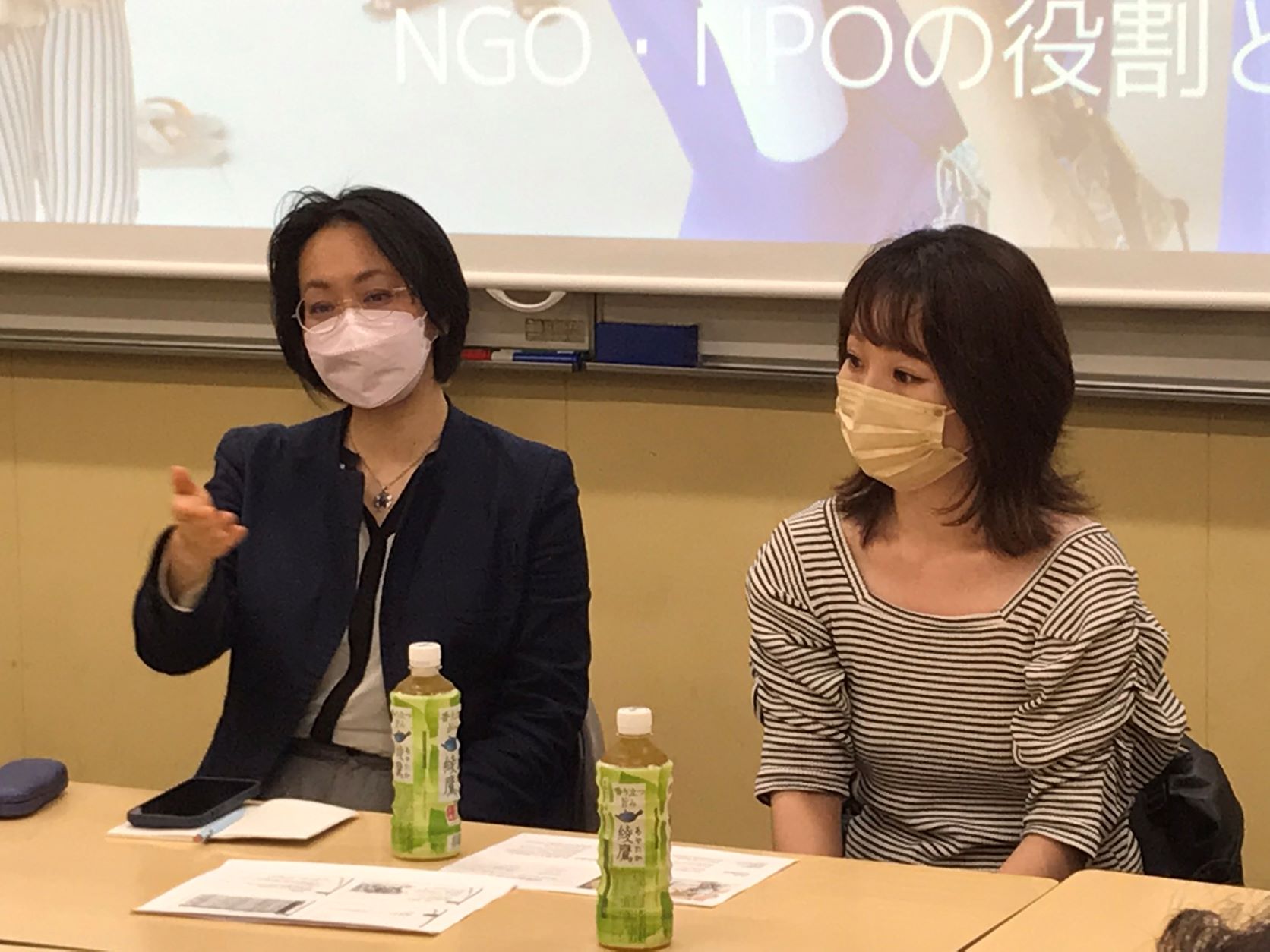 3年生ゼミ 上村さん・近藤さん(ゲスト)に来ていただきました(4月26日)10年前の2012年3月に小関ゼミを卒業した上村可南子さん(旧姓小川)が、久々に戻ってきてくれました。上村さんは卒業後、民間企業に就職し、広報関連の仕事をしてきましたが、学生時代に途上国に旅に出て、貧しい子どもたちに出会ったことから、 国際協力に関心を持ち、いつかその分野で仕事をしたいと願うようになったそうです。 縁あって、国際協力NGOの「認定NPO法人ジャパンハート」に転職し、広報の業務で働き始めました。一児の母として、忙しくも充実した日々を送っているとのこと。 小関ゼミ出身者でNPO/NGOに就職した上村さんには、今後とも大いに活躍してほしいです。 上村さんと同じくジャパンハートで広報を担当する近藤ゆふきさんは、国連やジョイセフなど、国際協力分野で多彩なキャリアを積んできたベテラン。 近藤さんに、ジャパンハートの活動について、わかりやすく解説していただきました。ゼミ生のなかから、上村さん・近藤さんに続いて、国際協力分野に進む人が出てきてくれることを期待しています。 (写真左から順に近藤さん・上村さん)