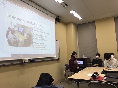 3年ゼミ・始動!(4月12日)長かった春休みも終わり、いよいよ新学期。3年生ゼミも12名で始動しました。初回(イントロダクション)では、共通する関心事をもとに、4つの班に分かれました。 「あんこう文化班」や「八幡山観光班」など、個性豊かなネーミング。これからの展開が楽しみです。 2021年度の活動3年生活動報告書を発行しました(1月24日)3年生が1年間の調査研究をまとめました。12月11日の合同発表会で報告した内容をさらに深め、報告書を作成しました。 また、3年生の1年間の歩みを、写真とともに振り返りました。 報告書表紙・報告書本文 ![]() 2年生ゼミ・杉澤さん(ゲスト講師)に来ていただきました(12月23日)NPO法人杉並アヤックスサッカークラブ理事長の杉澤幹生さんに、ゲスト講師として来ていただきました。杉澤さんは本学農学部卒で、サッカー部で活躍しておられた大先輩です。卒業後しばらくのブランクを経て、 地元杉並区でサッカークラブを立ち上げ、監督として子どもたちを指導してきました。 また、サッカーの指導だけにとどまらず、公園のグランドの管理を請け負う指定管理者となり、競技場で使える 芝生の管理を自らの事業として発展させていきました。 競技場の芝生の育成管理によって、サッカーをはじめとする競技場の環境を改善するとともに、芝生の事業から 得られた収益をサッカークラブの運営費用に充て、サッカークラブの子どもたちの財政負担を減らすことにも貢献しています。 杉澤さんはまた、NPO支援機構すぎなみの事務局長としても、NPOの発展を支えてきました。 スポーツを通して地域に貢献するとはどういうことなのか、杉澤さんの生き様から学ぶことができた貴重な機会となりました。 ![]() 3年生ゼミ・4年生から就活について教えてもらいました(12月21日)年末が間近に迫り、3年生も就職活動を始めています。就活が本格化するこの時期、既に内定を得た4年生に質問し、 就活に関してアドバイスをもらう機会を設けました。この時期に、何をすればよいのか。OB/OG訪問は必要なのか。など、3年生から質問を出し、4年生に答えてもらう形で進めました。 学生は近年、大学の就職支援をあまり利用せず、それぞれが一人でネットなどの情報を頼りに動く傾向にあるようです。 しかもコロナ禍で、友人や同級生に直接会う機会も少なくなっており、就活もオンラインで行うなど、周りが何をやっているのかが見えにくいなかで、 リアルに話を聞ける場が重要だなと改めて感じました。