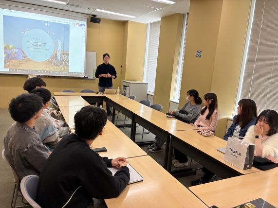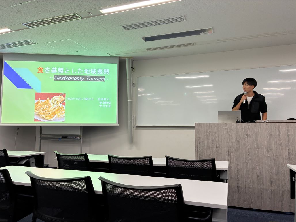 合同ゼミ発表会を開きました(12月15日)今年度は都合により立教大学のゼミが参加できませんでしたが、3年小関ゼミは今年、3年大高ゼミ(政治経済学部)とともに合同発表会を 開きました。小関ゼミの3年生は今年度、テーマパーク、コンパクトシティ、エンタメをそれぞれテーマとする3つのグループに分かれ、調査研究を 続けてきました。各グループはいずれも、これまでの調査研究の集大成として、熱のこもった良い発表でした。 対する大高ゼミは協同組合学のゼミで、今年は江東区豊洲地区のワーカーズコープを事例に、地域のコミュニティづくりの取り組みに着目 して本格的な調査研究を行ったそうです。ふだんのゼミ活動やレクリエーション、大高先生の温かい人柄なども伝わってきました。 発表の前後には交流会を開き、イントロクイズやジェスチャーゲームなどで楽しく盛り上がりました。 大高先生、各ゼミの学生の皆さん、日曜日にもかかわらず参加していただきありがとうございました!