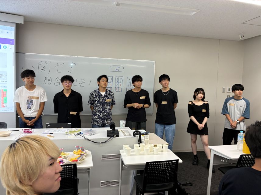 2年生の顔合わせ会を開きました(6月12日)今年度は、3年生がゼミナビや個別ガイダンスでゼミの紹介に力を注いでくれた結果、1次募集で2年生から驚くほど多数の 応募をいただきました。小関ゼミ始まって以来の快挙。3年生の皆さんありがとう!結果、15名を合格としました。もっと多くの学生さんを受け入れたいところではありましたが、これ以上人数が多くなると卒論指導に 支障が出て、全員に目が行き届かなくなってしまうため、15名とさせていただきました。不合格にしてしまった皆さん、ごめんなさい! 6月12日、3年生が主催して「顔合わせ会」を開きました。まずはお互いに顔と名前を覚えて関係を築く第一歩にしようということで、 和泉キャンパスの教室を借りて集まってもらいました。2年生13名が参加してくれました。ありがとう。 ひととおり自己紹介の後、グループに分かれてアイスブレイクのゲームをしたり、おしゃべりをしたりして和やかな時間を過ごしました。