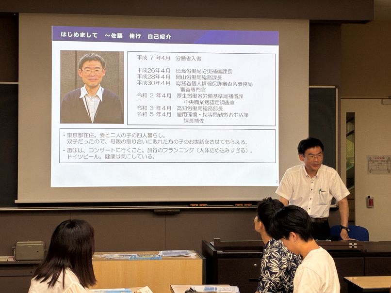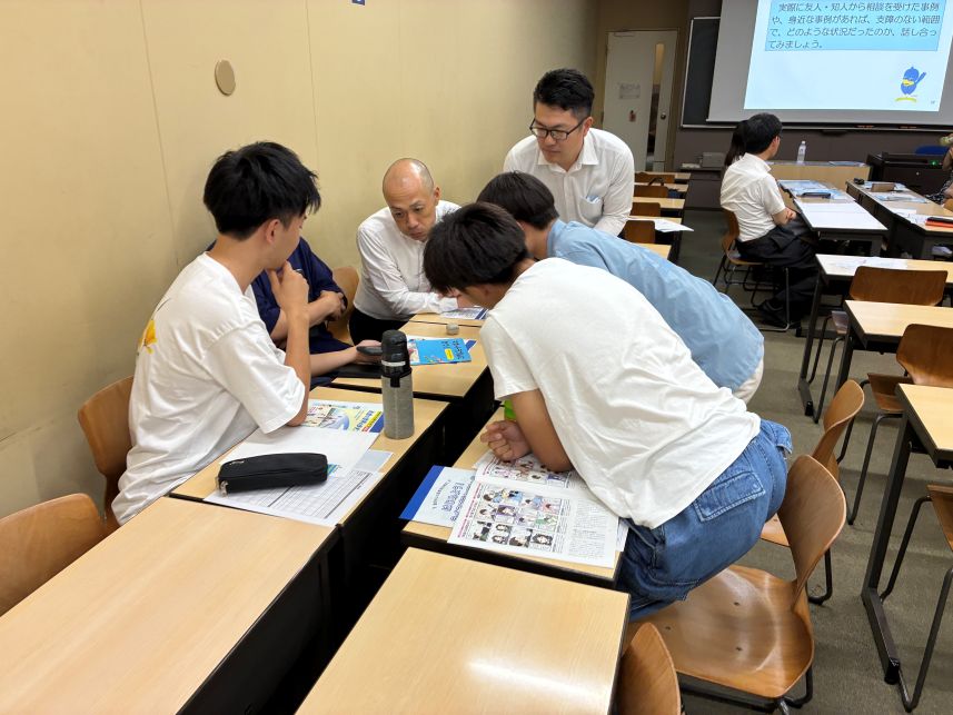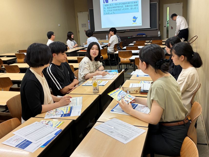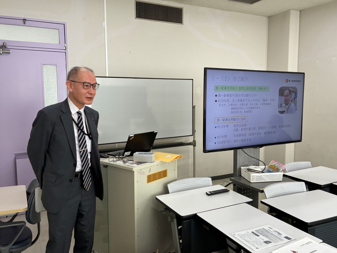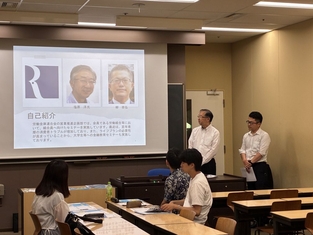 金融リテラシー教育の講座を開きました(7月8日)3年生のゼミに、労働金庫連合会の方と、厚生労働省の方をゲスト講師にお招きして、金融リテラシー教育の講座を開きました。消費者が様々なマネートラブルに巻き込まれる事例が起きていて、大学生もターゲットとしてねらわれています。詐欺や犯罪だけでなく、 衝動買いやギャンブル、投資などで資産を失うリスクもあります。 マネートラブルを予防することとあわせて、もしトラブルに巻き込まれてしまった場合にどう対処するかも重要です。泣き寝入りではなく、 専門の相談窓口に連絡することが解決の第一歩となります。 こうした自分を守るための知識とあわせて、今後の人生設計を考えた際にマネープラン、資産形成も欠かせません。だいたい何歳ぐらいまでに 大きな資金が必要となるのか、そのために資産形成をどうすればよいかも問われています。 労働金庫連合会の担当者の方々は、講師を務めるとともに、学生のグループ・ディスカッションにも加わっていただき、活発な意見交換が できました。 厚生労働省の方は、財形貯蓄制度を紹介していただきました。給料から天引きされて、定期的に貯蓄が増えていく点に魅力を感じます。 たいへん熱のこもった講義をありがとうございました!