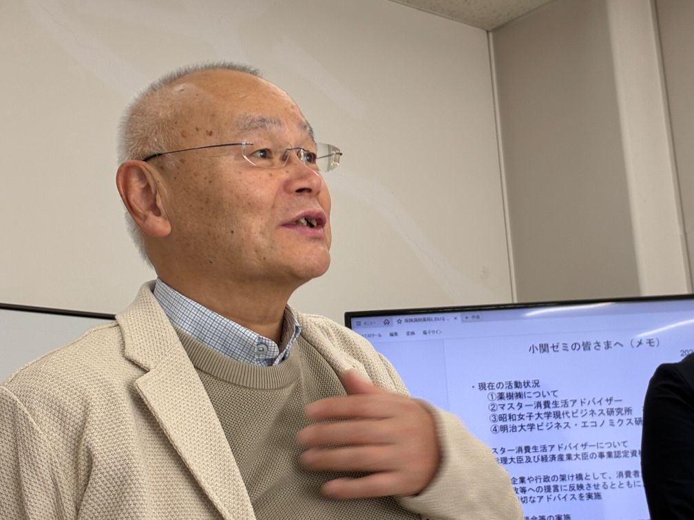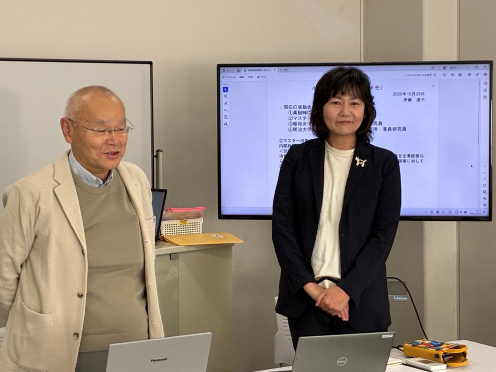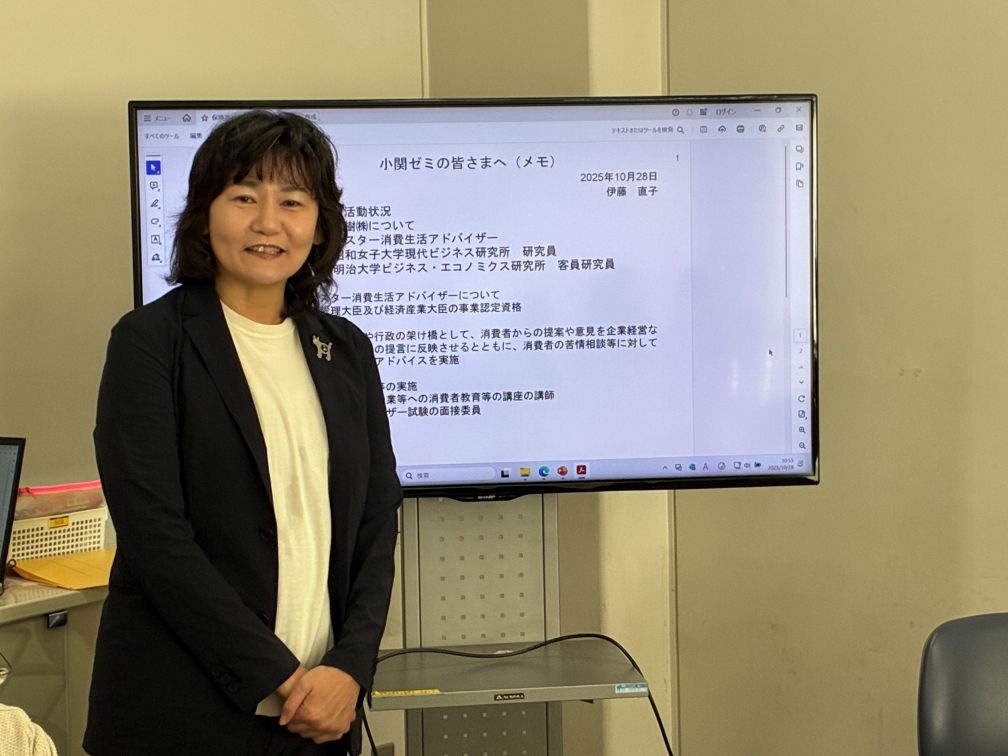 東京商工会議所の椛澤悠斗さんをゲスト講師にお迎えしました(11月18日)東京商工会議所・中小企業部の椛澤悠斗(かばさわ・ゆうと)さんにお話しいただきました。椛澤さんは小関ゼミの卒業生で、大学卒業後に製造業の企業に就職し、コロナ禍を経て2022年に東京商工会議所に転職しました。 中小企業経営者の相談を受ける仕事を経て、現在は中小企業に関する政策要望・提言を出す仕事に携わっているとのこと。 在学中から、中小企業支援には関心があったそうです。 椛澤さんには、東京商工会議所の組織・事業についてご説明いただいた後、学生からの質問に答えていただきました。 先輩からの貴重なお話と、後輩への心温まるメッセージ、ありがとうございました。 講義の後、企業経営者から相談されたらどう応えればいいのか、学生と意見交換しました。中小企業の経営を支援するというのは、 実際にはけっこう大変そうだな〜と感じました。 椛澤さんは、産学連携ということで、いまでもずっと、明治大学(⇒東京商工会議所の会員)とのつながりを保ってくれています。嬉しいですね。今後ますますの活躍を祈ります。 大阪大学の岩瀧敏昭先生、薬樹株式会社の伊藤直子さんをゲスト講師にお迎えしました(10月28日)大阪大学国際公共政策研究科の特任准教授、岩瀧敏昭先生と、薬樹株式会社執行役員の伊藤直子さんにお話しいただきました。岩瀧先生は地域活性化をライフワークとし、長年にわたって様々な地域で研究と実践にかかわってこられました。岩瀧先生には、 再生可能エネルギーに関連して、「地域の人に寄り添うのか、企業に寄り添うのか、環境保護なのか」というジレンマを提起していただきました。 他にも、京町家の事例から、景観保全に住民が関心をもって関わることの重要性や、「金儲けになる文化・ならない文化」という区分け、 さらには地震などの自然災害に関して避難所の改善の必要性など、多岐にわたる問題提起をしていただきました。 一言で地域活性化といっても様々な側面があり、また簡単に解決策が見いだせるものでもないことを感じました。 伊藤直子さんは、全国に多数の薬局を展開する企業の経営者ですが、この薬樹株式会社は単に薬を売るだけの普通の薬局ではないといいます。 それどころか、薬を減らそうとしているという、とても珍しい薬局なのだそうです。 高齢者が大量の薬を飲むことが本当に幸せなことなのかと問いかけ、地域コミュニティの中で豊かな人間関係を築くこと、自然環境を 整えていくことを重視した経営方針を掲げ、まさにSDGsの先駆けとして注目されてきました。 伊藤さんは本業のほかにも、マスター消費者アドバイザーや、大学の研究員の顔も持っていて、「二足のわらじ」ならぬ「四足のわらじ」 で、多方面で活躍されています。視野を広げ、価値観を豊かにするためにも、所属先を複数持つことが大事だと思いました。 とても興味深い講演、ありがとうございました。