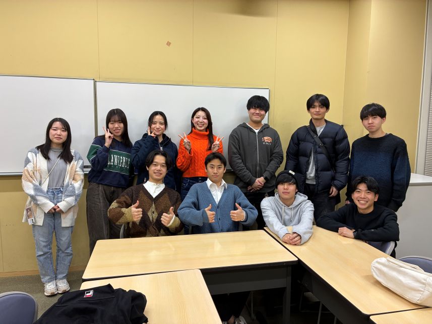 就活相談会を開きました(10月11日)4年生が自らの就職活動の経験をもとに、これから就活を始める3年生にアドバイスをする「就活相談会」を開きました。3年生の多くは、まだ希望の業種を決めておらず、今の時点で何をしておけばよいのか不安を抱えています。 4年生は、公務や商社、IT、コンサル、金融、メーカーなど様々な分野を選びましたが、分野・業種を問わず、3年生にとって大いに参考になったようです。 4年生の皆さん、ありがとう! 相談会の後は3年生の集合写真を撮りました。